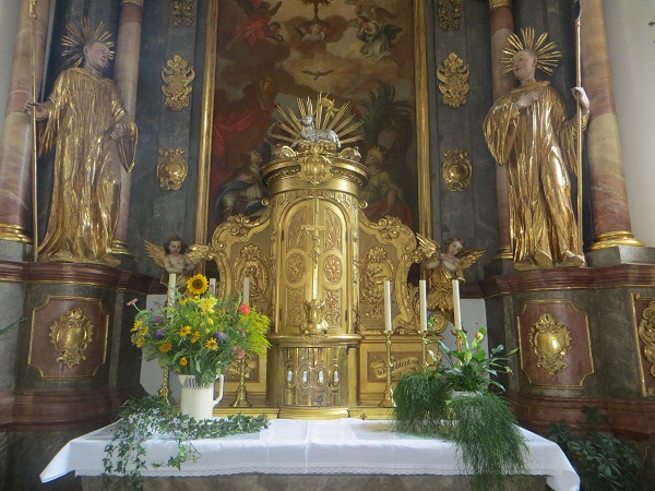 Der Chorraum: Dieser Teil der Kirche ist ein Relikt der 1722 erbauten Kirche, ebenso wurde die Innenausstattung von der alten Kirche übernommen. Der Hauptaltar ist viersäulig aufgebaut, zwischen den Säulen stehen, links St. Ägidius, rechts der hl. Wendelin. Auf dem Gebälk sitzen Putten und ein Gitterwerk umrahmen ein ovales Heiligenbild (hl. Kolonat). Das Altarbild veranschaulicht die Verehrung des Allerheiligsten. 1889 wurde ein neuer Tabernakel eingebaut, um 1970 kamen einbruchsichere Türen in den Tabernakel. Der Altartisch bildet den Abschluss des Chorraumes.