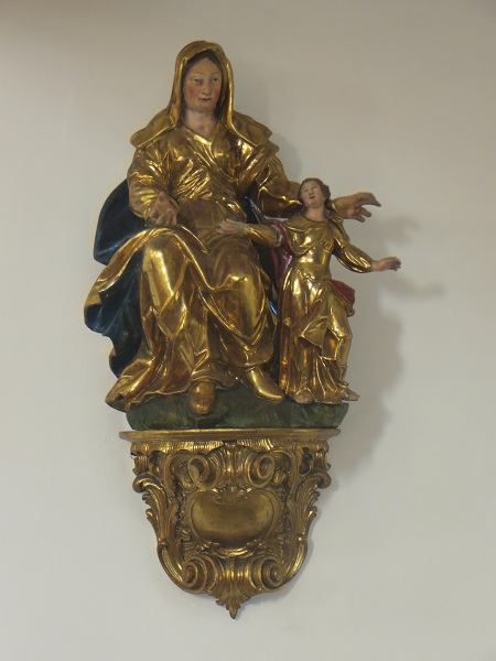 Schmerzhafte Mutter mit Leichnam Jesu (4), links unter der Empore. Die Himmelskönigin (5) neben dem Marienaltar und Herz Jesu (2) neben dem Josefsaltar. Mutter Anna mit Maria (3) rechts unter der Empore. Der heilige Urban mit Buch (1), rechts an der Wand. Links an der Wand, der heilige Josef mit Jesuskind an der Hand (6).